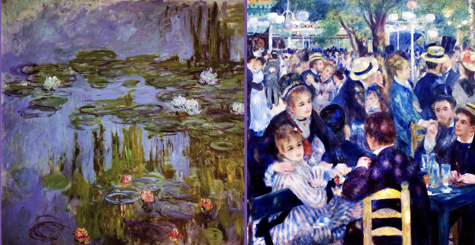 Claude Monet, Nymphéas c. 1915 y Auguste Renoir, Bal du moulin de la Galette, 1876. (Detalles).