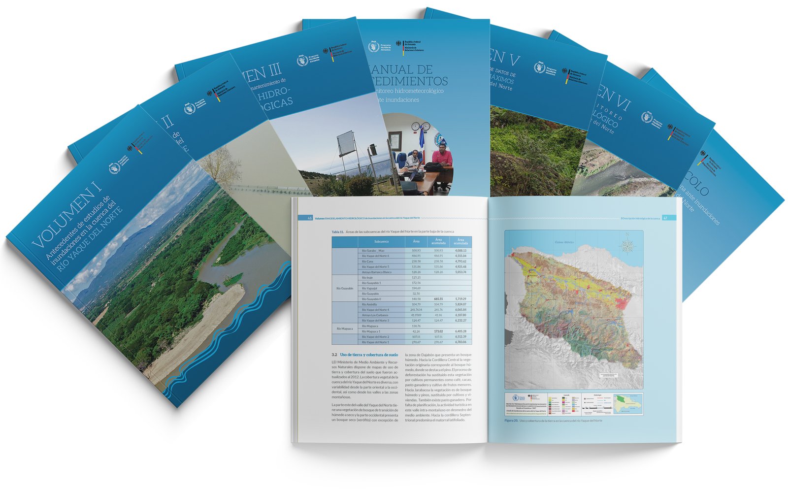 CLIENT: World Food Programme (WFP) | PROJECT: Forecast-based Financing (FbF) for Climate Risk Preparedness. SCOPE: Comprehensive editorial design and data visualization for a technical series regarding flood forecasting and hydrological modeling in the Yaque del Norte River Basin.